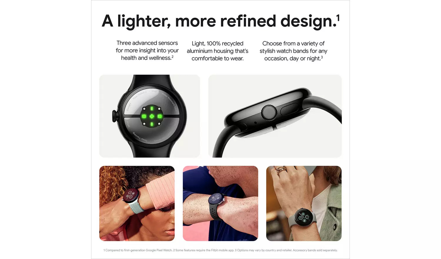 Google brings the best of Fitbit tech to the Pixel Watch 2. Sensors have been upgraded for their most spot-on heart rate tracking yet. Powered by AI, it gives you the nitty-gritty on calories burned, active minutes, and even your sleep patterns. You'll also get real-time alerts about potential stress triggers and how to tackle them with its body-response feature. It's a fantastic tool for maintaining mental wellbeing in our fast-paced world. The skin temperature sensor meanwhile keeps an eagle eye on any fluctuations, helping you stay on top of your wellness game. Made for the everyday, the light, 100% recycled aluminium housing gives this watch a comfy, barely there feeling.